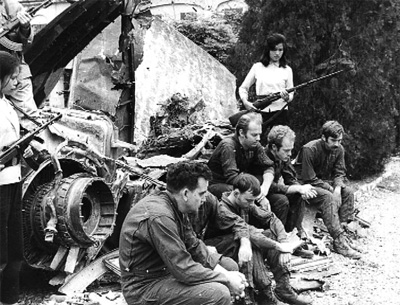 Phi công Mỹ bên xác máy bay B-52 bị bắn rơi ở Hà Nội. Ảnh: Cảnh trong phim "Hà Nội - Bản hùng ca" của Điện ảnh Quân đội.