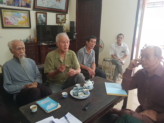 Người thân của các chiến sĩ cách mạng trong vụ đắm đò và nhân chứng trao đổi với phóng viên. Ảnh: THÙY NGÂN. |