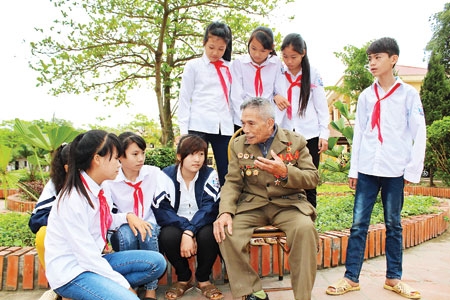 | CCB Nguyễn Hải Trung kể chuyện vượt ngục Phú Quốc với các cháu học sinh Trường THCS xã Minh Quang, huyện Tam Đảo, tỉnh Vĩnh Phúc. |