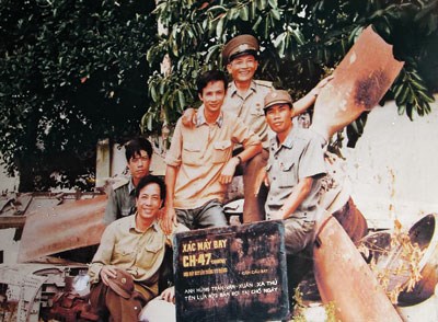 Đại tá, Anh hùng LLVT nhân dân Trần Văn Xuân (đội mũ kê-pi) cùng các bạn chiến đấu A72 bên xác máy bay địch do ông bắn hạ. Ảnh tư liệu.
