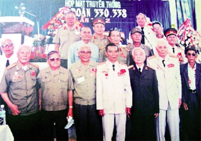 Đại tá Nguyễn Văn Tòng (hàng trước, thứ ba từ trái sang) cùng đồng đội chụp hình lưu niệm với Đại tướng Võ Nguyên Giáp, năm 2005.
