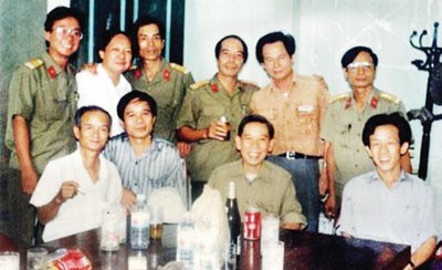 Nhà văn Phạm Quang Đẩu (đứng thứ tư, từ trái sang) và các đồng nghiệp ở “Phố nhà binh”. Ảnh tư liệu.