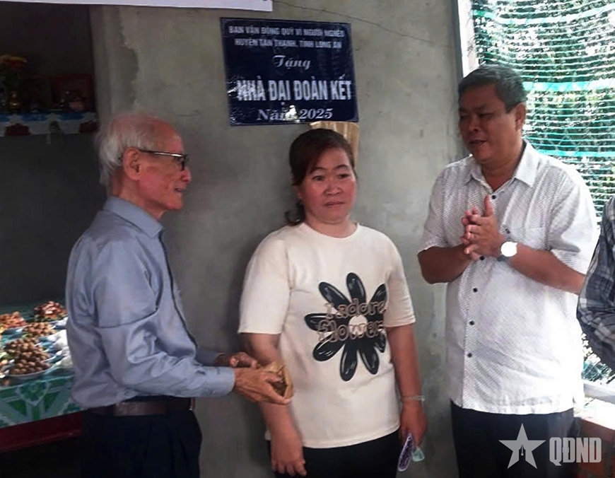 Tác giả (bên trái) thăm hỏi thân nhân các nạn nhân trong vụ thảm sát tại xã Tân Hòa (nay là xã Tân Thạnh, tỉnh Tây Ninh). Ảnh: BÙI HIỀN