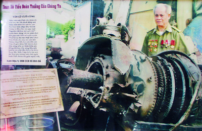 CCB Phạm Văn Chắt bên chiếc động cơ máy bay B-52 trưng bày tại Nhà truyền thống Trung đoàn 285 (Đoàn Nam Triệu). Ảnh chụp lại.