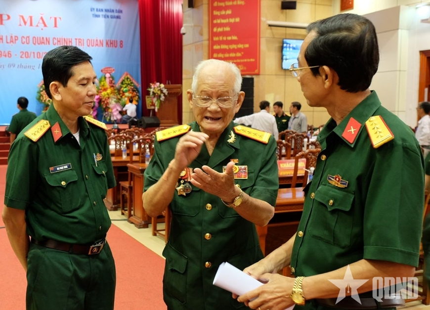 | Đại tá Nguyễn Văn Phương (giữa) trao đổi với lãnh đạo Đoàn Văn công Quân khu 9 trong ngày họp mặt truyền thống. Ảnh: TRUNG KIÊN |