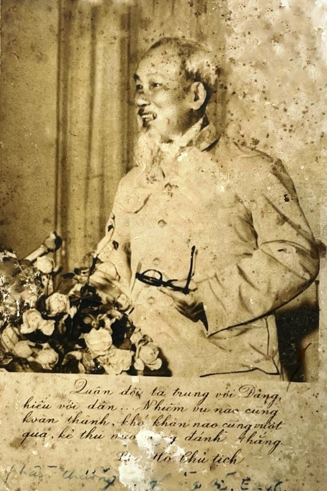Tấm ảnh Bác Hồ và bút tích của dũng sĩ Nguyễn Quang Khuyên, năm 1969. Ảnh chụp lại