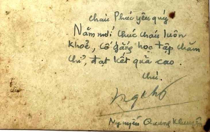 Từ câu chuyện về những kỷ vật, quà tặng của người dũng sĩ-nhà giáo Nguyễn Quang Khuyên, tôi liên hệ và đến nhà riêng của ông Nguyễn Quang Ninh ở số 134 đường Lê Lai, phường Bắc Giang, tỉnh Bắc Ninh. Trong căn nhà ấm cúng, ông Ninh giới thiệu những kỷ vật chú Khuyên tặng, trong đó có tấm ảnh Bác Hồ, phía sau tấm ảnh là dòng chữ được viết nắn nót: “Cháu Phúc yêu quý, năm mới chúc cháu luôn khỏe, cố gắng học tập chăm chỉ, đạt kết quả cao. Chú: Nguyễn Quang Khuyên” (ngày nhỏ, vì trùng tên húy với ông tổ của gia đình hàng xóm nên ở nhà, ông Ninh có tên gọi khác là Phúc).