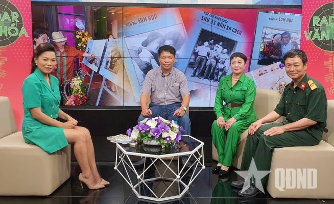 | Nhạc sĩ Vũ Minh Vỹ (ngoài cùng, bên phải) kể chuyện những năm tháng ở Trường Sơn. Ảnh do tác giả cung cấp |