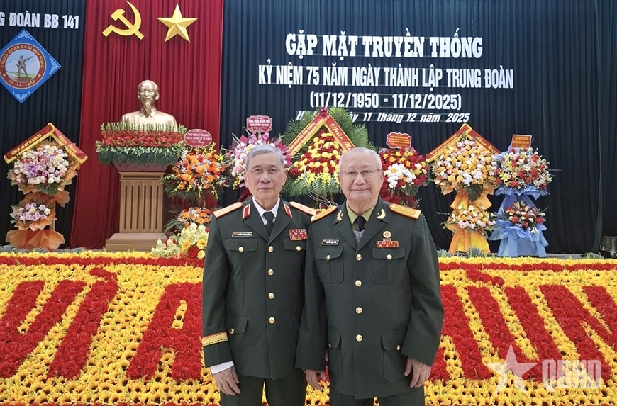 | Trung tướng Nguyễn Trọng Thắng (bên trái) tại buổi gặp mặt truyền thống Trung đoàn 141, Sư đoàn 312 (tháng 12-2025). Ảnh do tác giả cung cấp |