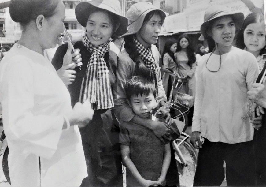 | Nhà báo Minh Hiền (thứ hai, từ trái sang) trong lần tác nghiệp sau ngày giải phóng miền Nam, tháng 5-1975. Ảnh do tác giả cung cấp |