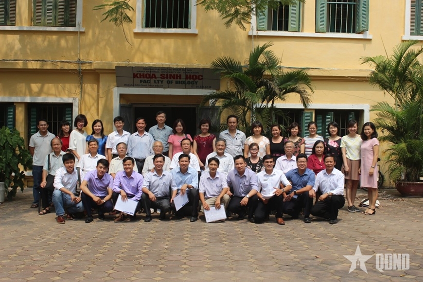 Cựu sinh viên Khoa Sinh học, Trường Đại học Sư phạm Hà Nội với PGS, TS Nguyễn Quang Vinh (hàng giữa, thứ tư, từ trái sang). Ảnh do nhân vật cung cấp