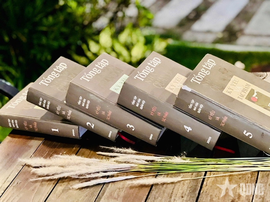 | Bộ sách “Tổng tập Nhà văn Quân đội - Kỷ yếu và tác phẩm”. Ảnh: NHƯ QUỲNH |
