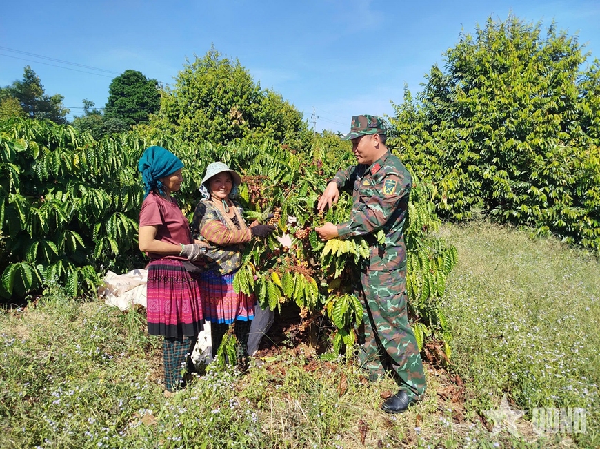 | Bộ đội hướng dẫn đồng bào Tây Nguyên cách canh tác, phát triển các loại cây công nghiệp. Ảnh: QUANG SÁNG |