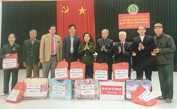 Bà Bích Liên (đứng giữa) tặng quà hội viên Hội Cựu thanh niên xung phong xã Thuần Mỹ, huyện Ba Vì, TP Hà Nội, năm 2018. Ảnh do nhân vật cung cấp. |