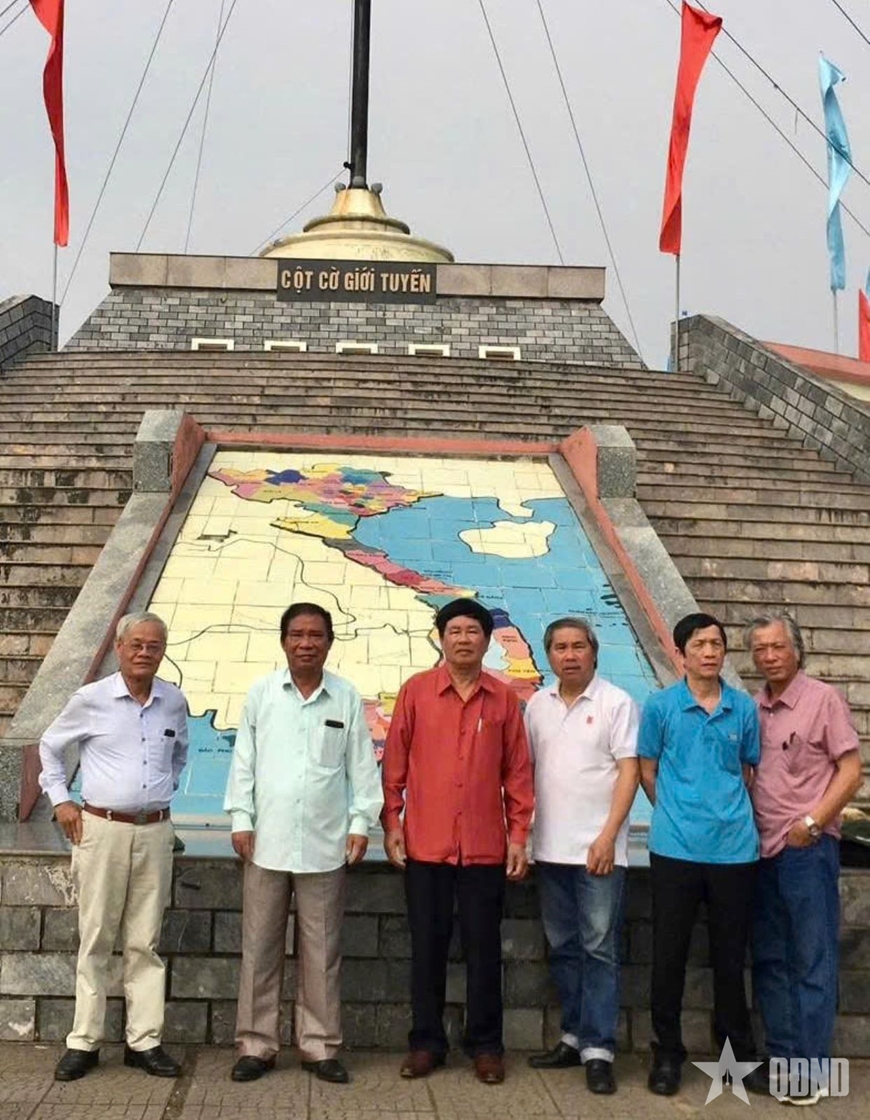 | Tác giả (thứ ba, từ phải sang) cùng bạn bè K8 dưới chân cột cờ Hiền Lương, tháng 4-2025. Ảnh: XUÂN LỢI |