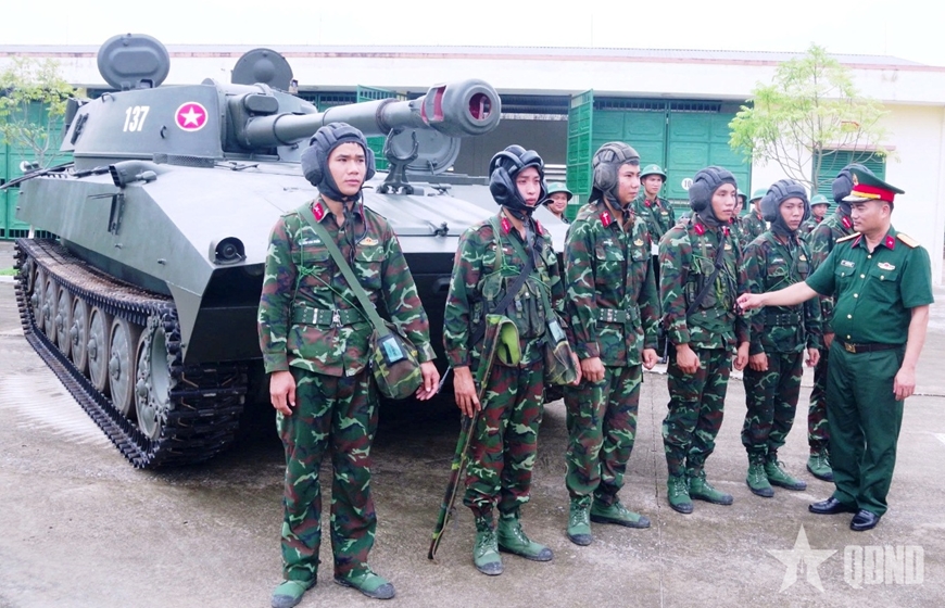 Cán bộ Trung đoàn Pháo binh 68 kiểm tra kíp pháo thủ trước khi bước vào huấn luyện. Ảnh: ĐỨC GIANG